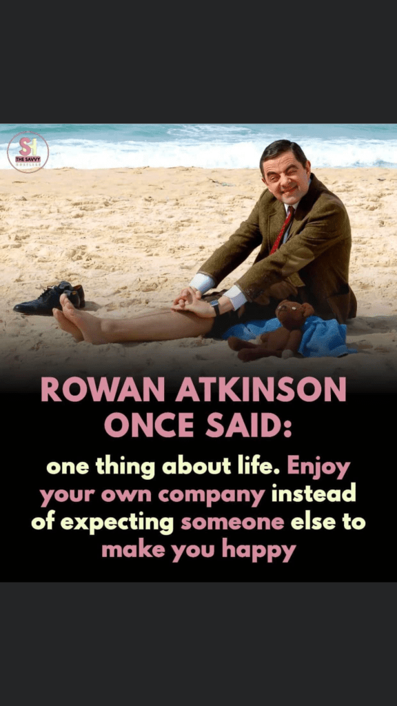 So my challenge to you over the next year is to find time to be alone with just you. Enjoy the peace. Learn to like the silence without all the distractions that exist in our modern lives. And be happy with just you.